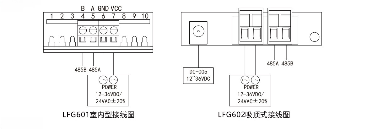 根據(jù)選型不同,下圖分別室內(nèi)型及吸頂式接線方式。注意吸頂式帶DC-005(5.5*2.1mm)電源插座,可用匹配電源適配器供電(12~36VDC),也可用接線端子供電(12~36VDC /24VAC±20%),但兩種供電方式不可同時(shí)接入!